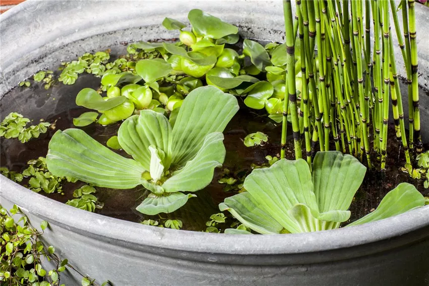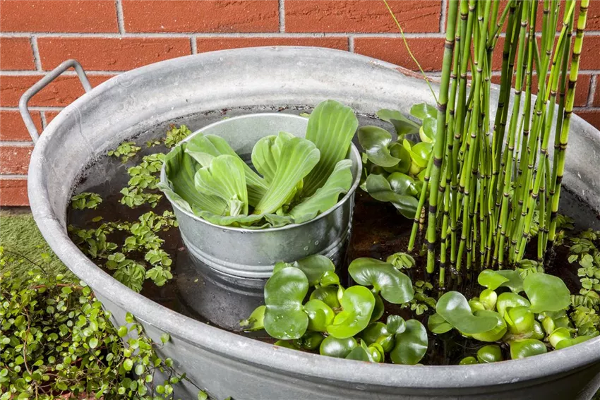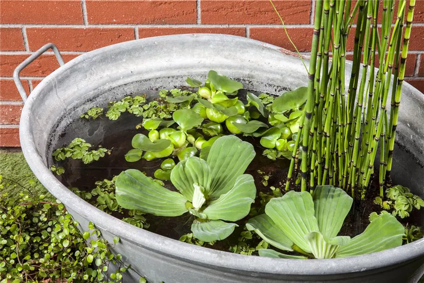 Pistia stratiotes Ein Mini-Teich bietet die Möglichkeit, auch auf kleinstem Raum nicht auf einen Teich verzichten zu müssen. Egal ob Balkon, Terrasse oder sogar im Wohnzimmer – ein Mini-Teich findet überall Platz. Das zentrale Element im Mini-Teich ist das Gefäß, in dem sich das Teichleben abspielt. Das kann entweder freistehen oder im Garten oder in die Terrasse eingelassen werden. Das Behältnis für den Mini-Teich sollte groß genug sein, um mindestens zwei Pflanzkörbe fassen zu können. Das sorgt dafür, dass der Teich sich besser selbst pflegen kann und der Mini-Teich nicht zum Algentreff wird. Ein Gefäß, das nach oben breiter wird, sorgt für einen guten Halt der Pflanzkörbe und bietet genügend Platz, damit sich Schwimmpflanzen optimal ausbreiten können. Bevor aber der Mini-Teich angelegt werden kann, sollte unbedingt sichergestellt werden, dass der Untergrund, auf dem der Mini-Teich stehen soll, stabil genug ist, um die Wassermenge zu tragen, die sich später im kleinen Teich befinden wird. Sind Gefäß und Standort gefunden, kann der Mini-Teich eingerichtet und befüllt werden. Dabei gibt es das ein oder andere zu beachten.