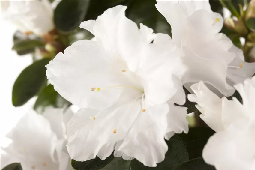 Rhododendron simsii, weiß Die über 100 Sorten der Zimmerazalee reichen von A wie „Adonia“ bis Z wie „Zoe“ und bieten ein unendliches Farbenspektrum. Von edlem Weiß, feurigem Rot über Gelb, Rosa oder Pink ist alles dabei. Die Blüten unterscheiden sich aber nicht nur in der Farbe, sondern auch in der Form. Es gibt Zimmerazaleen mit weitgeöffneten Trichtern, wieder andere haben eher röhrenförmige Trichter-Blüten. Jede Pflanze ist anders und das macht die über 100 Sorten der Zimmerazalee so einzigartig. Wann die verschiedenen Sorten blühen, ist genauso vielfältig wie die Farbe und Form der Blüten. Die Sorte „Eleonore“ blüht im Januar, die Sorte „Paloma“ hingegen im August.