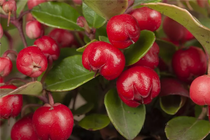 Gaultheria procumbens Mit einer Scheinbeere im Garten bekommt man einen farbenfrohen Bodendecker, der in der grauen Jahreszeit Farbakzente im Blumenbeet setzt. Die Pflanze ist im Beet auch Dekoration.